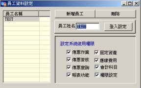 二、員工資料設定l 功能:新增本系統使用者的登入名稱及密碼 設定該使用者的系統使用權限。