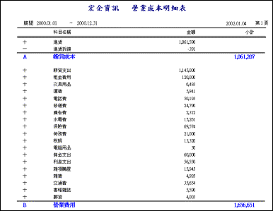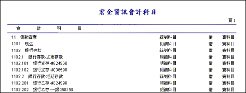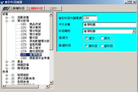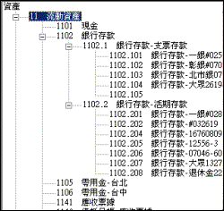 三、會計科目l 功能:可編輯或新增符合公司需求的科目名稱及代碼,科目代碼及名稱以層次分明的樹狀結構顯示,可展開顯示細目或關閉只顯示大類。 類似WINDOWS檔案總管的操作方式清晰明瞭且易於管理。