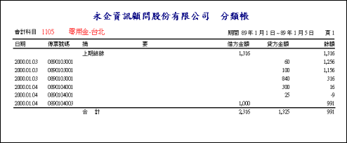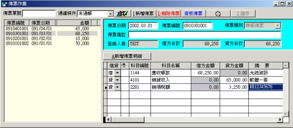 四、傳票作業l 功能:1.編輯傳票:左欄是傳票清單,右欄是點選該張傳票的內容明細。 2.過濾傳票:左欄傳票清單的過濾條件有簽核、未簽核、傳票單號等。 3.簽核傳票:簽核輸入之傳票,簽核過的傳票不可編輯、修改、刪除。 4.預覽傳票:在清單中點選傳票後可立即快速預覽及列印該傳票的報表