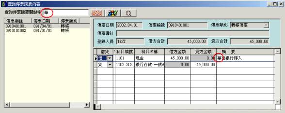 五、傳票摘要查詢l 功能:在左欄上方輸入關鍵字。即過濾出傳票中,摘要欄內有出現該字的傳票清單。