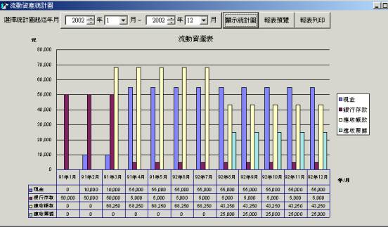 六、流動資產統計圖l 功能:將會計科目中流動資產之科目類別為「現金科目」、「銀行存款」、「應收帳款」、「應收票據」四類的傳票金額繪成統計圖表及報表。