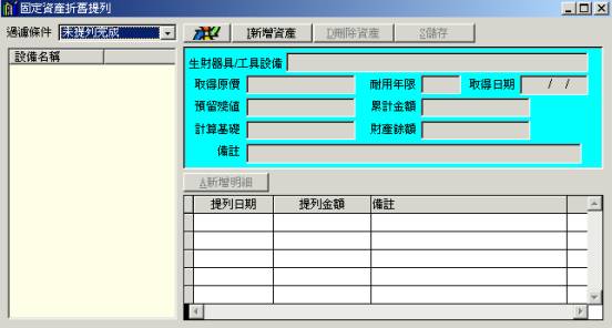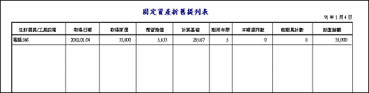 七、固定資產l 功能:供使用者紀錄管理公司生財器具設備。輸入取得原價及耐用年限系統將自動提列折舊。