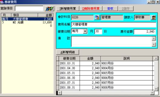 八、固定應繳費用l 功能:紀錄管理公司固定應繳費用的每月(或每週、年)繳費情況。